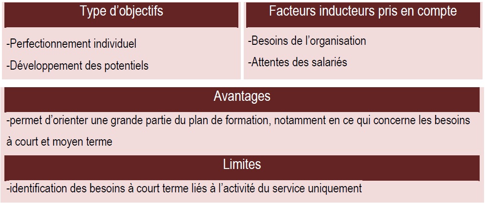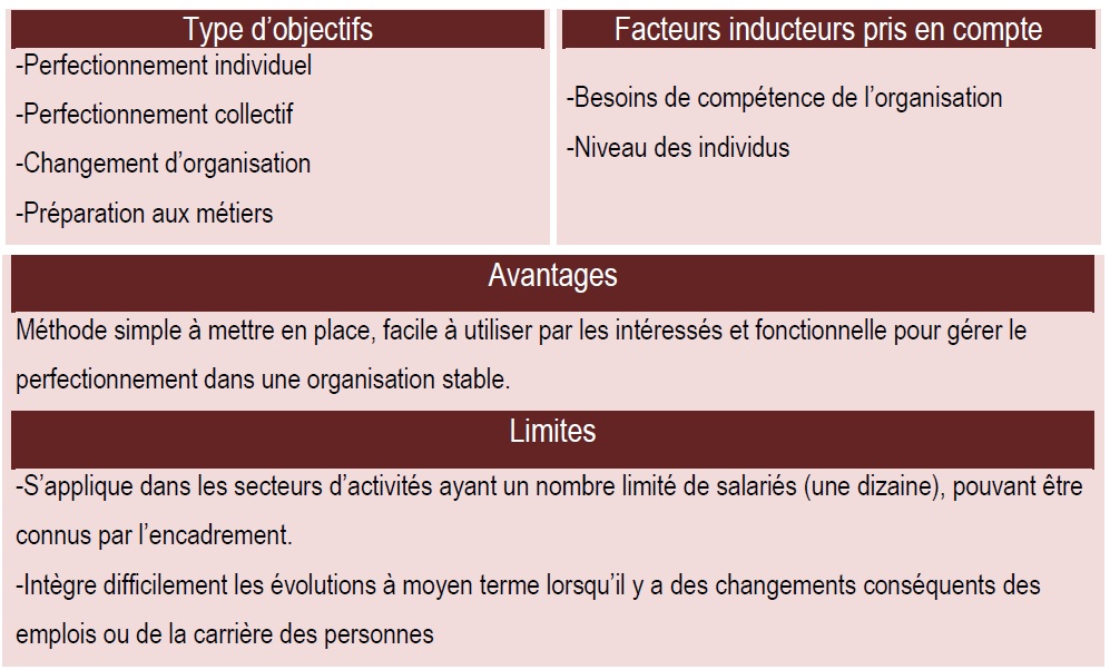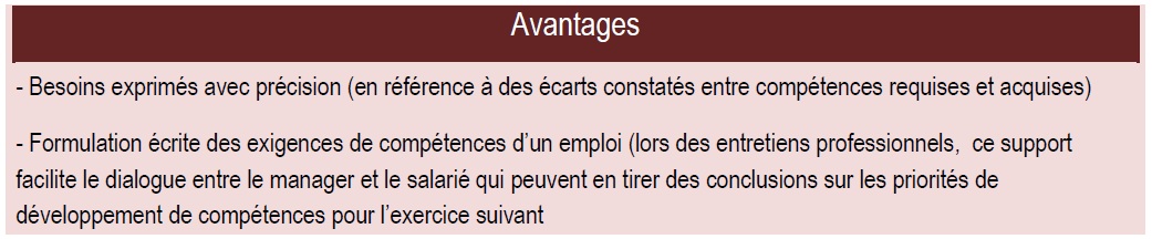Les compétences sont exprimées en termes de verbes d’action donc très exploitables ultérieurement pour définir des objectifs de formation. Avantages -permet d’orienter une grande partie du plan de formation, notamment en ce qui concerne les besoins à court et moyen terme Limites -identification des besoins à court terme liés à l’activité du service uniquement