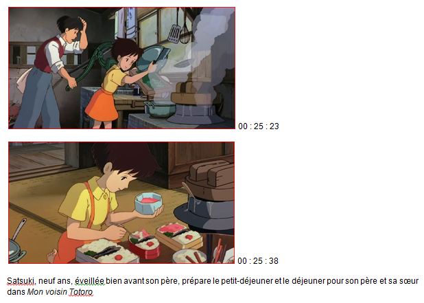 Il est intéressant de noter que dans Mon voisin Totoro, nous retrouvons un schéma correspondant aux modèles féminins des années cinquante, l’histoire étant située à cette époque : les sphères masculines et féminines sont séparées –Satsuki s’occupe de sa sœur et de la nourriture, cela étant probablement le travail de sa mère avant son départ- mais la famille est bouleversée par l’absence de la mère. Le père se retrouve donc dans un rôle inhabituel à l’époque : s’occuper de ses enfants sans sa femme.