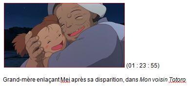 La scène où Grand-Mère amène Mei à l’école de Satsuki révèle également combien la grande sœur a repris le rôle maternel, sa petite sœur ne pouvant se passer d’elle et ne trouvant aucun réconfort ailleurs. Lors de la disparition de Mei, Satsuki part à sa recherche. Elle n’est pas une enfant dans ces instants où elle pense à sa sœur, en étant responsable. Les seuls instants où nous retrouvons une petite fille sont ceux où elle cherche du réconfort auprès de Grand-Mère, leur voisine, craignant la mort de sa mère à l’hôpital.