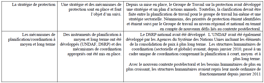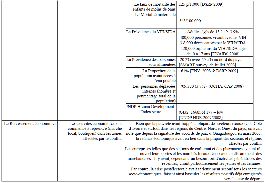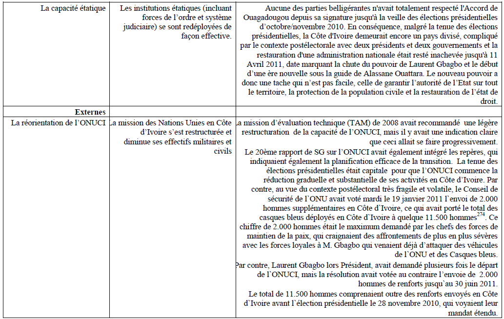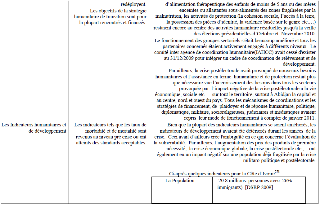 Tableau VI: Synthèse des résultats issus de l’analyse des indicateurs et des point de repères de la transition politico-humanitaires en la Cote d’’Ivoire