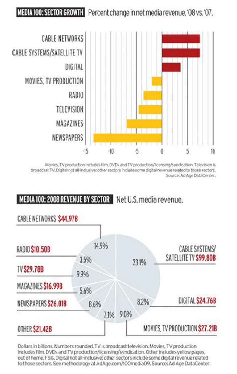 This graphic shows that in the United States the digital media has almost the same revenue as newspapers. Additionally it shows how revenues of newspapers are quickly dropping and revenues of digital media are growing instead. Their power was larger in the information business as well.