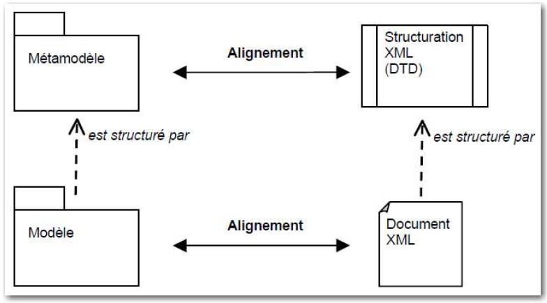 Figure 41 : Alignement entre modèle/métamodèle et DTD/document XML (Blanc 2005, p.103)
