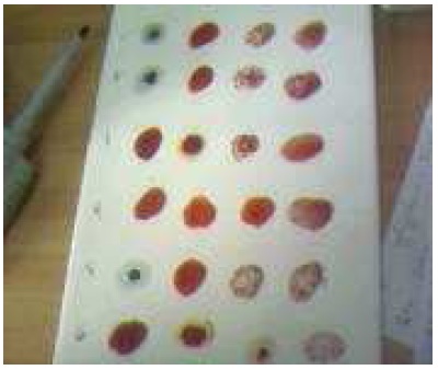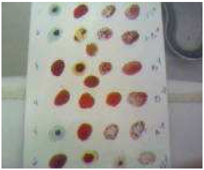 - On ajoute ensuite à chacune de ces gouttes une goutte de sang de l’échantillon à tester (voir photo 3) ;