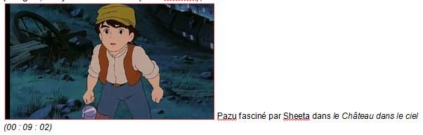 profondément. Cette impression est d’ailleurs confirmée par une mise en scène montrant explicitement Pazu sous l’emprise de cette fascination pour Sheeta : le plan le montre en plongée, les yeux vers le ciel (vers Sheeta), soumis à cette vision.
