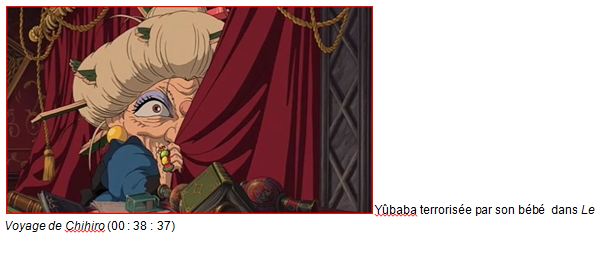 Sa voix et ses expressions changent également : celle-ci se fait mielleuse, douce. Yûbaba est en fait une mère –malgré son âge- terrorisée par les caprices de son enfant et qui en est l’esclave. Elle n’est plus puissante face à son enfant, mais une vraie mère poule, aux petits soins pour son fils et répondant à ses moindres désirs. Ce changement de situation permet de voir le personnage de Yûbaba comme un personnage plus complexe qu’au premier abord, puisque parallèlement à sa toute puissance dans le petit monde surnaturel dans lequel a été propulsée Chihiro, elle se retrouve esclave d’un bébé. Mais cette faiblesse permet de lui redonner un peu d’humanité, lui apporte un côté sympathique, sans lequel son personnage aurait été entièrement négatif.