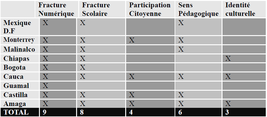En premier lieu, toutes les écoles coïncident en considérant que l’usage de TICs dans l’enseignement est indispensable pour éviter l’écart entre les populations qui ont accès à la technologie et celles qui ne l’ont pas. En deuxième lieu, il est à noter l’importance de la prévention de l’écart scolaire face aux besoins du contexte contemporain. En troisème et quatrième lieu, nous trouvons le sens pédagogique et la participation citoyenne qui sont présentes dans les écoles avec les projets pédagogiques. Finalement, l’identité culturelle a été identifiée dans les deux écoles indigènes visitées et dans une école rurale en Colombie avec un projet local.