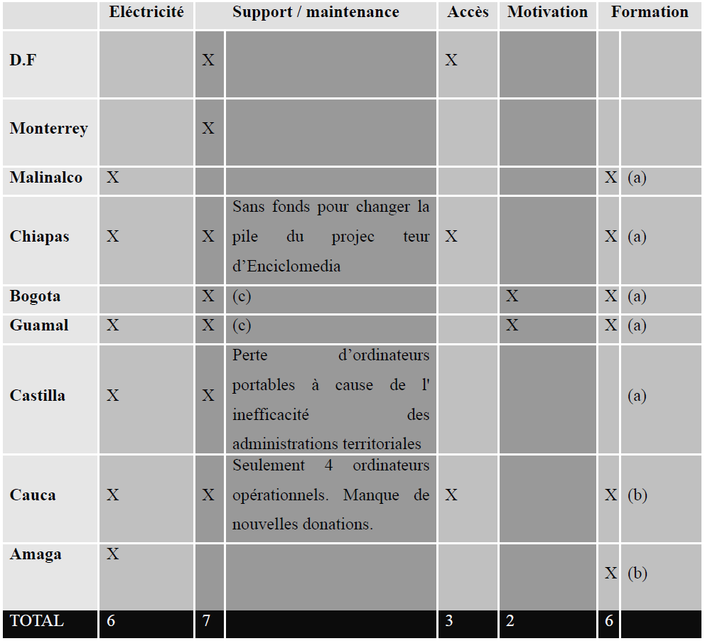 Après l’arrivée des ordinateurs, deux écoles au Mexique n’ont pas utilisé les équipements pendant les deux premières années à cause du manque de formation des enseignants. En Colombie, la valorisation de l’usage réel actuel des équipements a été plus difficile qu’au Mexique, car les écoles utilisent les ordinateurs selon un horaire ou un plan flexible.