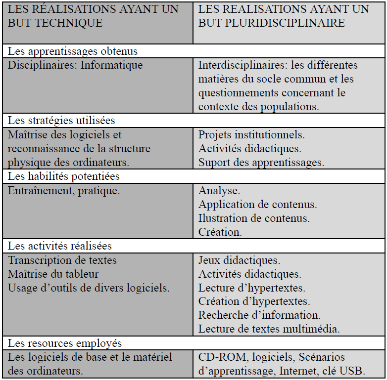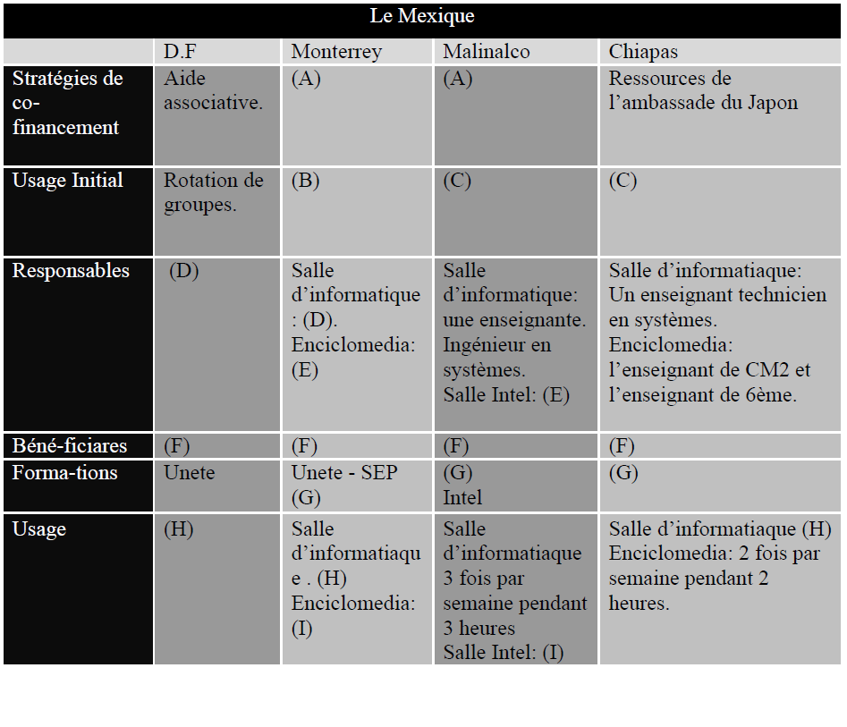 Les usages et les ressources dépendent des programmes et des buts éducatifs des écoles. En bref, l’école secondaire technique de Malinalco et l’école de Chiapas utilisent la salle d’informatique seulement avec des buts de formation technique. Les écoles qui ont les programmes d’Intel et Enciclomedia les utilisent avec des objetifs pédagogiques. L’école de Monterrey, qui a un projet éducatif transversal, utilise la salle d’informatique avec des intentions pédagogiques d’orde didactique et technique.