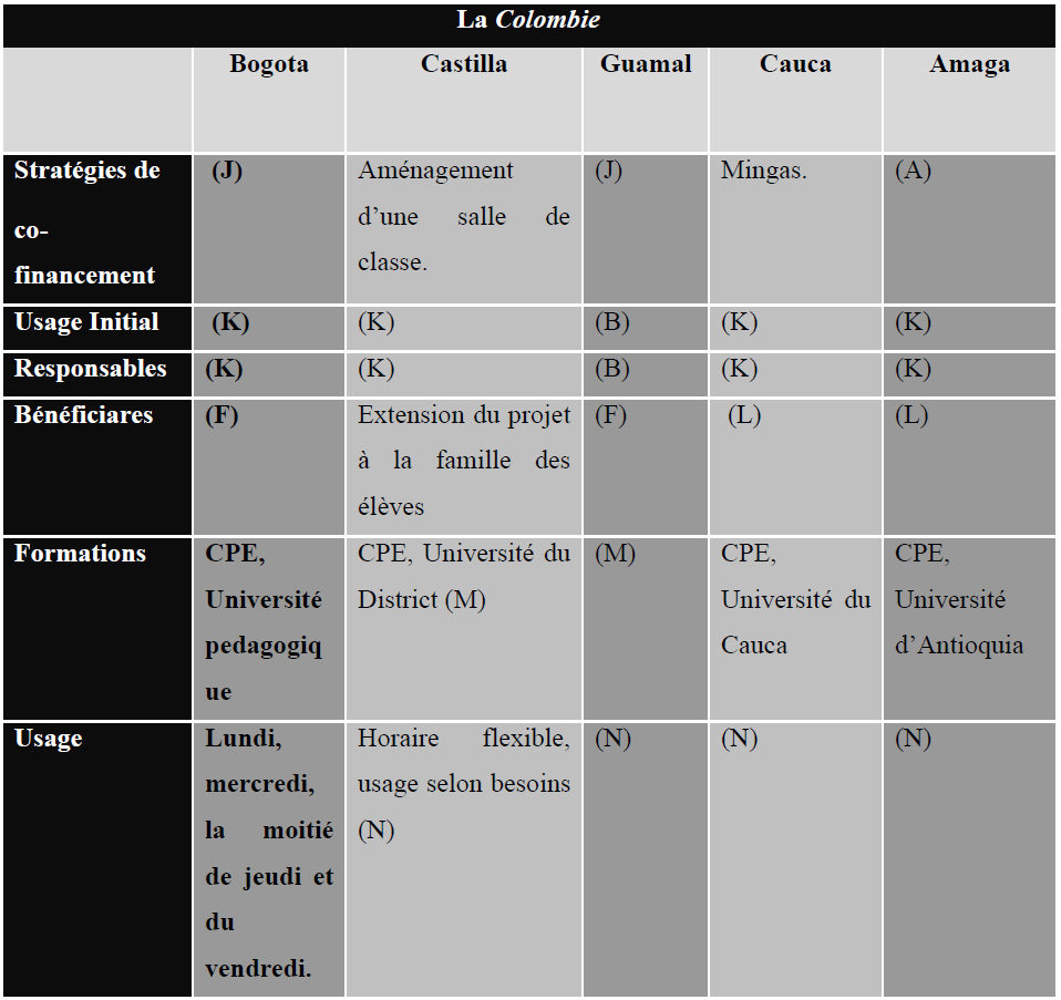 En Colombie, toutes les écoles ont des horaires flexibles, sauf Bogota qui utilise la salle 3 fois par semaine. La flexibilité empêche de connaître l’usage réel des équipements et le plan d’action de chaque enseignant.