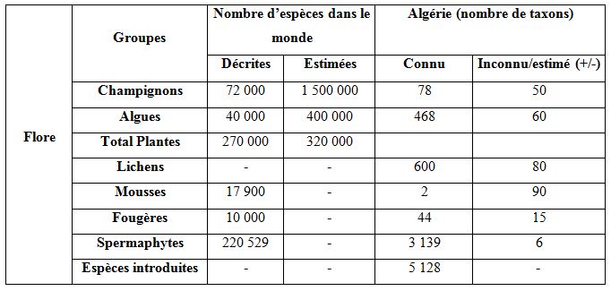 La flore algérienne est très diversifiée en taxas, car elle présente les principaux groupes floristiques. Le tableau suivant montre les principaux groupes floristiques en Algérie.