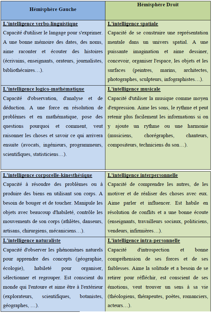 Tableau 1 : « Les intelligences multiples et les hémisphères cerveau »