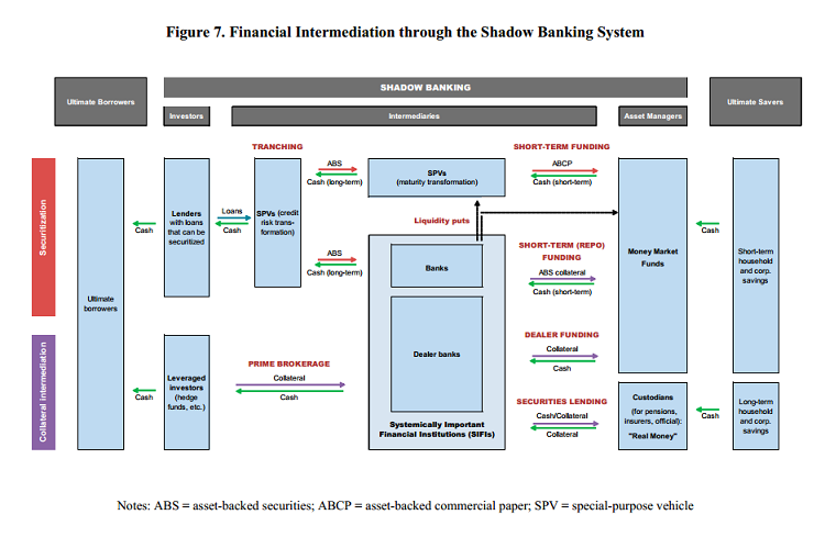 Ce schéma illustre bien les liens entre les établissements régulés (Banques, Prime Brokers) et non régulés sont nombreux. Les interactions au sein du shadow banking sont par ses agents ou par ses mécanismes d’échange reliées au secteur bancaire. Ses activités sont majoritairement complémentaires aux activités classiques permettant une optimisation des investissements.