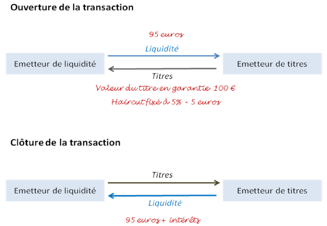 Le schéma 1 décrit une opération de pension classique. Lors de l’ouverture de la transaction la partie qui détient des liquidités à investir, l’émetteur de liquidité, achète des titres auprès de la partie souhaitant emprunter des liquidités, l’émetteur de titres. Le montant du haircut est un pourcentage défini en amont par les deux parties en fonction de différents critères des titres (volatilité, liquidité et la qualité des intervenant dans le collatéral).
