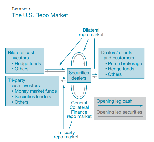 Credit Suisse peut alors passer l’obligation à un money market funds jusqu’à l’échéance. Notez que dans cet exemple la même obligation du Trésor a été utilisée trois fois en tant que garantie, par le propriétaire d’origine, des hedge funds aux money market funds. Le repo est donc un moyen de prêter du cash sans altérer son profil de liquidité.