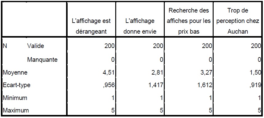 Avec ces résultats, nous remarquons que les clients perçoivent les affiches de perçoivent les affiches de promotion en allée centrale. En effet, ils sont en moyenne plutôt pas d’accord voir pas du tout d’accord sur le fait que cela les dérange. Sur le fait que cela leur donne envie, ils répondent plutôt d’accord voir neutre (moyenne= 2,81).