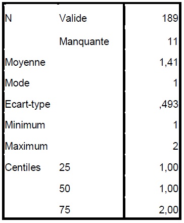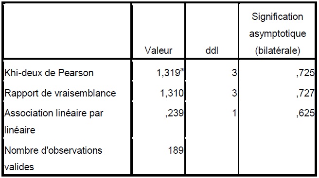 Au travers du test du khi2, nous pouvons malheureusement voir que l’effectif est insuffisant (33%) pour permettre une analyse des résultats.