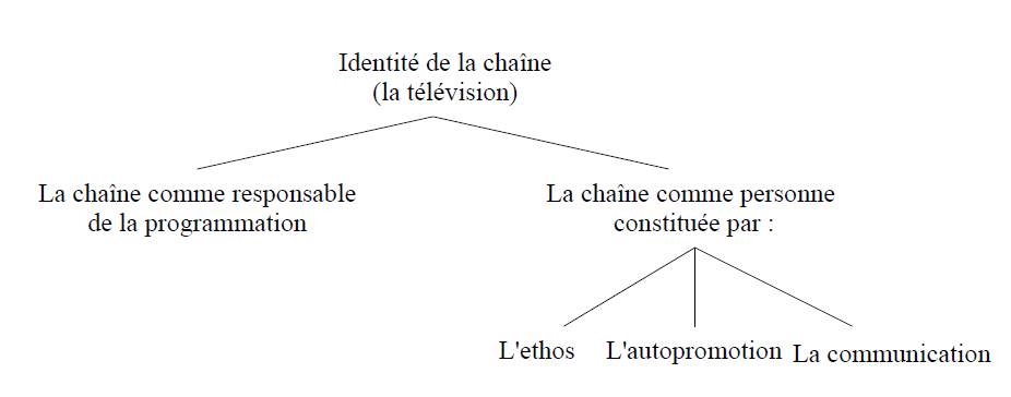 Pour faire passer son discours, une chaîne s’occupe d’abord de la programmation, mais par ses choix de programmes, elle prend l’image d’une personne. Comme une vraie personne, à travers ses actes et ses décisions, elle transmet ses valeurs. Cette transmission peut s’effectuer de trois façons différentes : par son discours, par son auto-promotion et par la communication qu’elle fait à travers les autres médias.(49) François Jost réalise un schéma explicatif(50) :