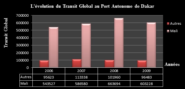 Ce trafic reste tiré par le transit Mali, qui a accusé un recul de 9% .Notons que le transit global contribue à hauteur de 8% au trafic portuaire, on remarque également une baisse du trafic autre durant l’année 2009