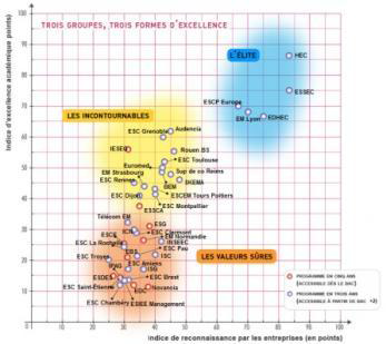 Être diplômé d’école de commerce c’est avant tout disposer d’un diplôme généraliste. Toutes les GEC ont leur diplôme visé par le Ministère de l’Education Nationale. Sortir avec un bac + 5 en poche, une formation généraliste souvent spécialisée dans un ou deux domaines selon les stages effectués pendant le cursus scolaire, et parfois un semestre de spécialisation selon les écoles, tel est le bagage d’un diplômé de GEC. Ce bagage acquis doit servir à valoriser son diplôme, en revanche le diplôme n’est pas l’élément déterminant pour rentrer dans le monde de la santé. Cette idée se retrouve dans tous les constats. En effet, ce qui valorise le diplôme c’est ce que le diplômé en fait. Venir d’une des 4 ou 5 meilleures GEC (cf. groupe 2lite sur le schéma ci-dessus) a l’avantage d’offrir plus de portes d’entrée dans des grandes entreprises qui parfois ne recrutent que des diplômés des GEC parisienne.