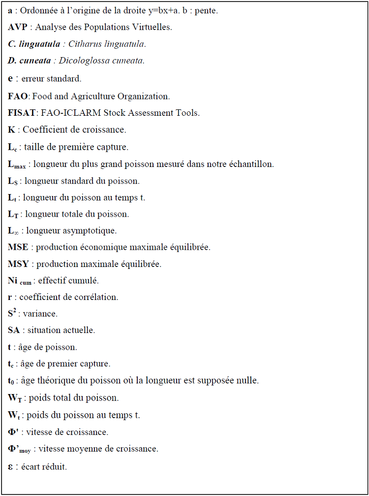 Abréviations admin 12 ans ago Page suivante : IntroductionRetour au menu : Croissance et exploitation de deux espèces de poissons plats pleuronectiformes des eaux algériennes : Citharus linguatula (Linnaeus, 1758) et Dicologlossa cuneata (Moreau, 1881)
