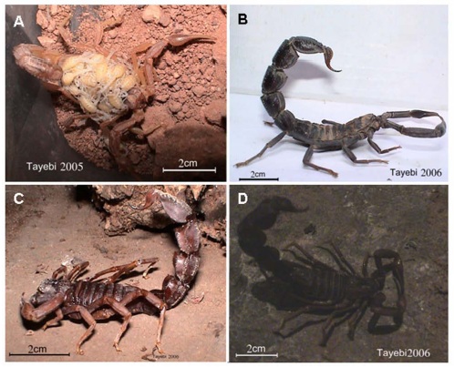Buthus occitanus femelle avec pullus (A), Buthotus franzwerneri (B) et Androctonus mauretanicus (C et D).