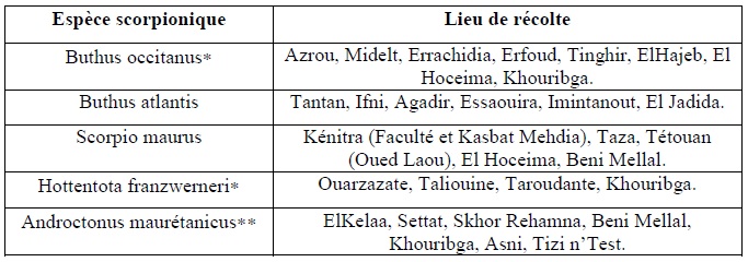 Dans le but de collecter différents scorpions à travers le Maroc, pour une détermination et une cartographie, trois longues missions ont été effectuées. Les scorpions récoltés ont été classés en cinq ensembles d’espèces principales selon la description de Vachon (Tableau II).