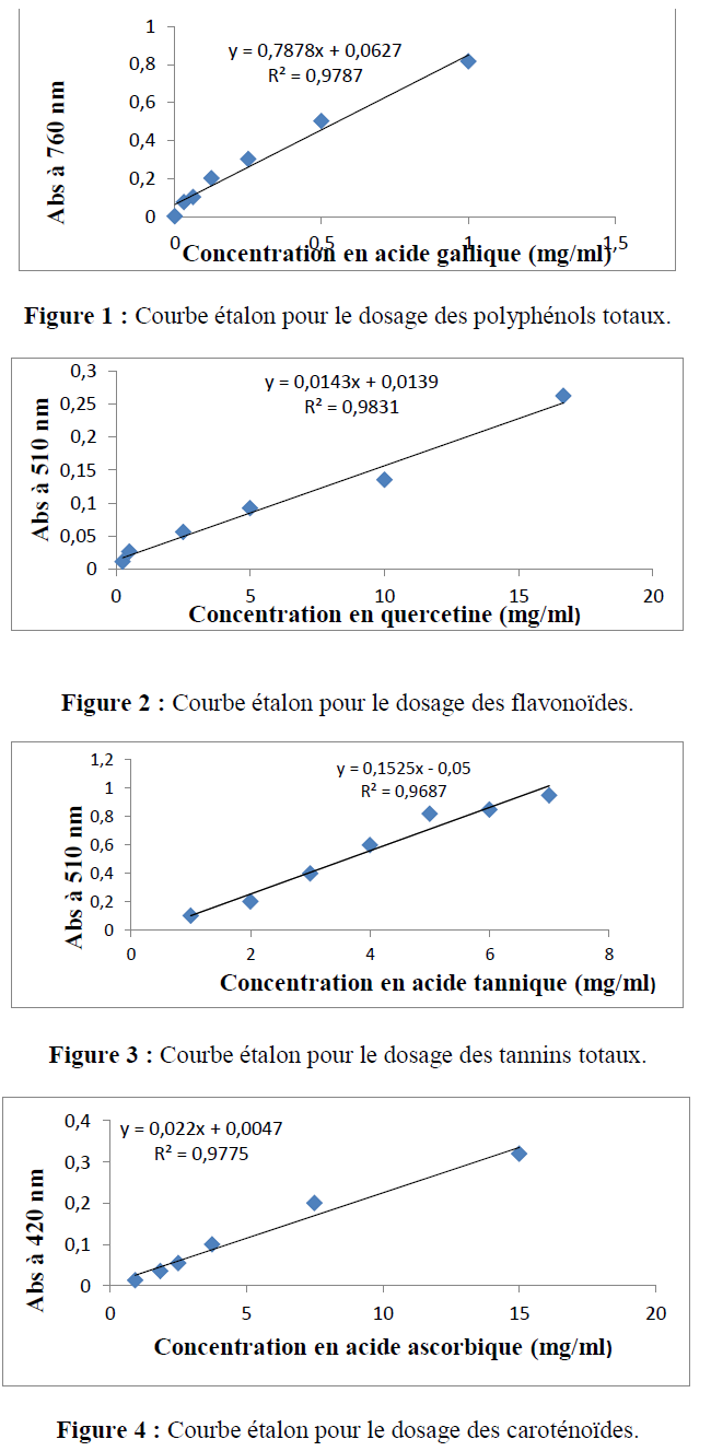 Annexe 03 : Courbes d’étalonnages utilisées pour le dosage des composés phénoliques admin 12 ans ago Page suivante : Annexe 04 : Préparation des solutions utilisées pour le dosage des tannins totauxRetour au menu : Essai de fabrication d’une boisson médicinale à base de gel d’Aloe arborescens et du miel et évaluation de sa qualité