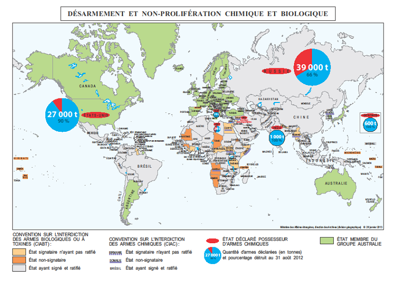 Annexe 1 : Carte de désarmement et de non-prolifération chimique et biologique, réalisée en janvier 2013 admin 12 ans ago Source : Ministère français des Affaires étrangères Direction des Archives (division géographique). Page suivante : Annexe 2 : Sites présumés d’armes chimiques en Syrie, réalisée en 2013 par Nuclear Threat Initiative (NTI).Retour au menu : La prohibition de l’utilisation des armes chimiques au sein des conflits armés à travers l’exemple syrien : étude sur les règles et les principes relatifs aux moyens et aux méthodes de guerre en droit international humanitaire