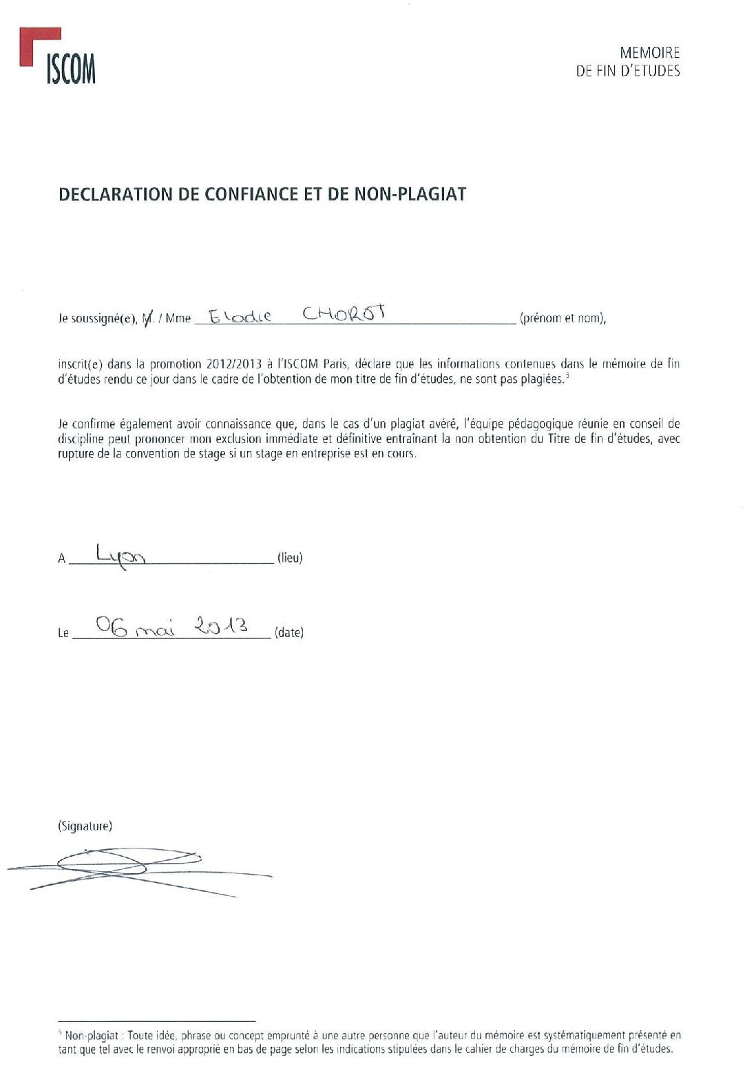 Annexe 1 : Déclaration de confiance et de non-plagiat admin 13 ans ago Page suivante : Annexe 2 : Fiche n°2 directeur de mémoireRetour au menu : La communication face aux pratiques culturelles des 18-26 ans