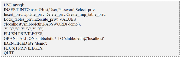 Créons un utilisateur shibboleth avec pour mot de passe « demo » et limiter les permissions à la base de données shibboleth.