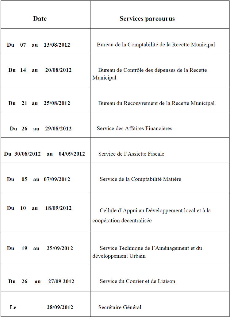 Annexe 1 : Les différents services parcourus durant mon stage à la CAY 2 admin 12 ans ago Page suivante : Annexe 2 : Modèle de compte rendu des Activités de StageRetour au menu : Décentralisation et Fonctionnement des Communes au Cameroun : cas de la Commune d’Arrondissement de Yaoundé 2 (CAY 2)
