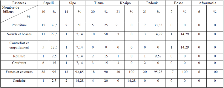 Annexe 1. Notes de nombres des défauts par essences analysées et leurs pourcentages admin 12 ans ago Page suivante : Annexes 2. Fiche sur les études effectuées sur 40 billons composés par les essences de Sapelli, Sipo, Tiama, kosipo, etc.Retour au menu : Rapport de Stage effectué à la Société de Développement Forestier (SODEFOR) du 19/11/2012 au 30/01/2013 : Scierie et Usine de déroulage