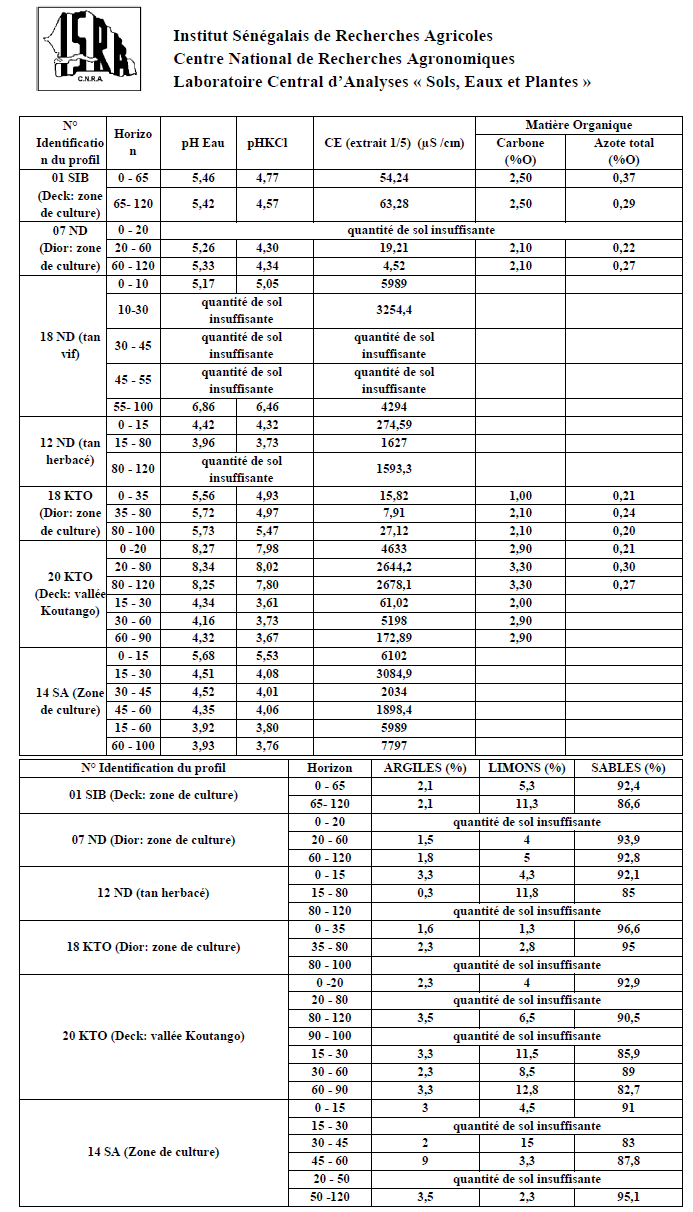 Annexe 1 : Résultats analyse des sols admin 12 ans ago Page suivante : Annexe 2 : Les indices spectrauxRetour au menu : Application de la Télédétection aérospatiale pour l’évaluation de la dégradation des ressources naturelles : cas des sols de la région de Kaolack située dans le Bassin arachidier du Sénégal