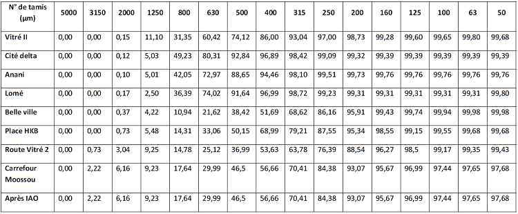 ANNEXE 1 : Tableau récapitulatif des pourcentages des refus cumulés en fonction des diamètres des tamis admin 12 ans ago Page suivante : ANNEXE 2 : Courbe granulométrique des échantillons prélevésRetour au menu : Etude des propriétés hydriques de la zone non saturée de la nappe du Quaternaire au Sud de la Côte d’Ivoire : zone de Grand-Bassam