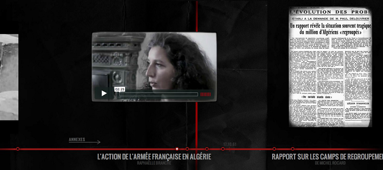 différents documents défilent à l’horizontal. « D’accord, je viens de comprendre la principe ». Ce genre de remarque au cours des entretiens ne sont ni rares ni anodines. Elles témoignent simplement que les manipulations de certains webdocs historiques nécessitent un véritable apprentissage. Elle lance la vidéo ”Salah”. Après avoir hésité d’avancer la vidéo, elle finit par l’interrompre au bout de trois minutes de lecture. Elle continue à faire défiler les documents puis retourne à la carte. Elle fait glisser son curseur sur les différents personnages sans cliquer avant de fermer le web-documentaire.