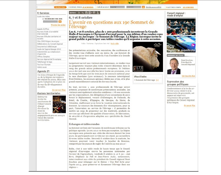 Annexe 17 : Article « L’avenir en questions aux 19e Sommet de l’élevage » paru sur le site officiel de la Région Auvergne le 29/09/2010