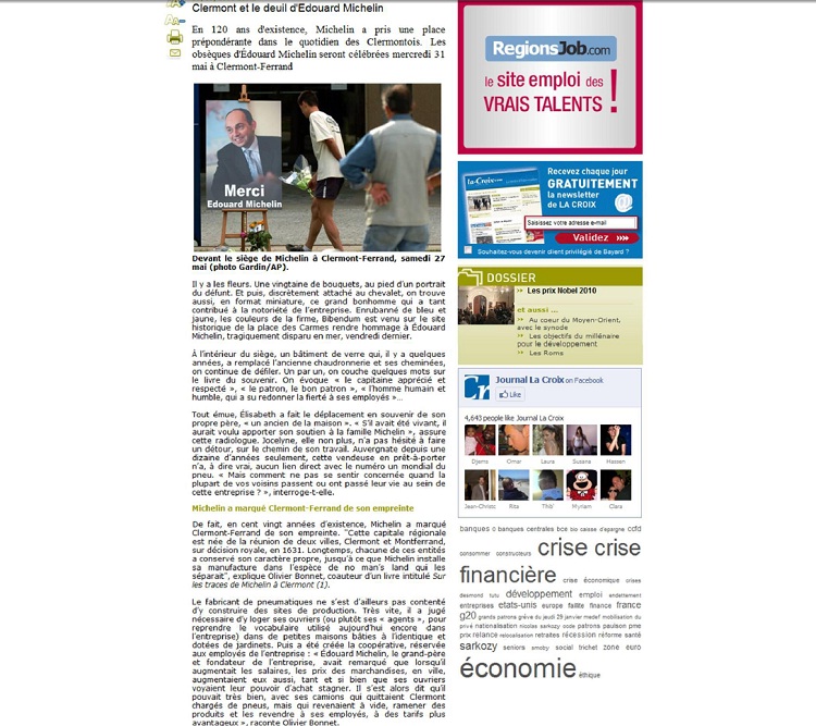 Annexe 18 : Article « Clermont et le deuil d’Edouard Michelin » paru dans La Croix le 30/05/2006