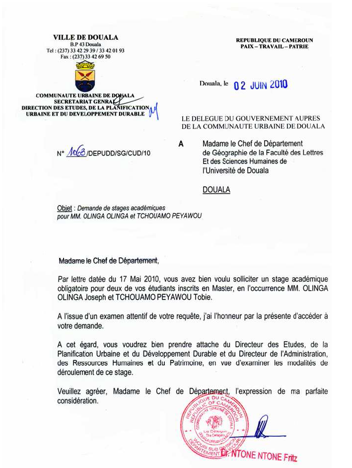 ANNEXE 2 : Accord de stage de la Communauté Urbaine de Douala