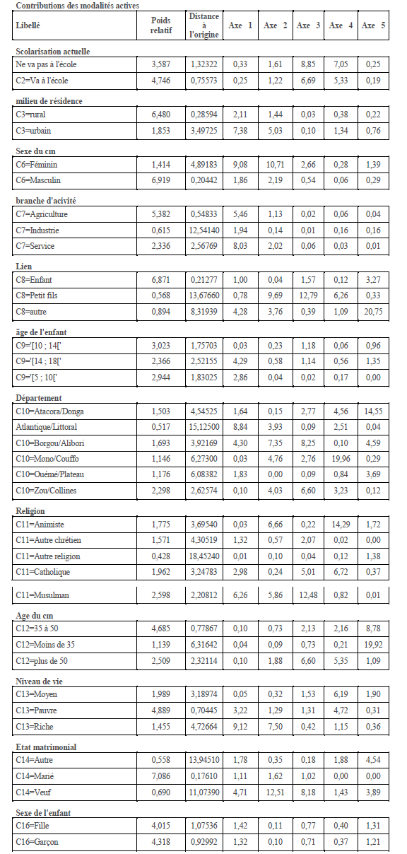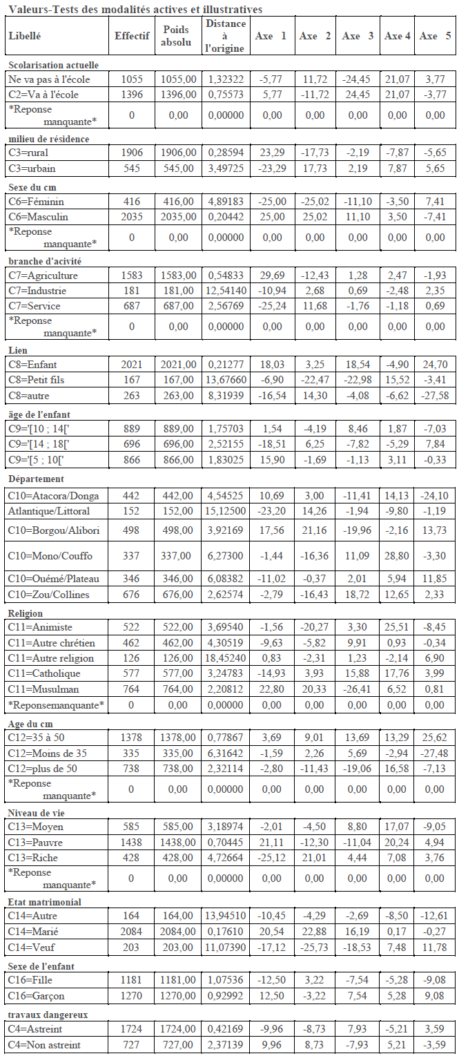 Tableau 14: Coordonnées des modalités sur axes factoriels