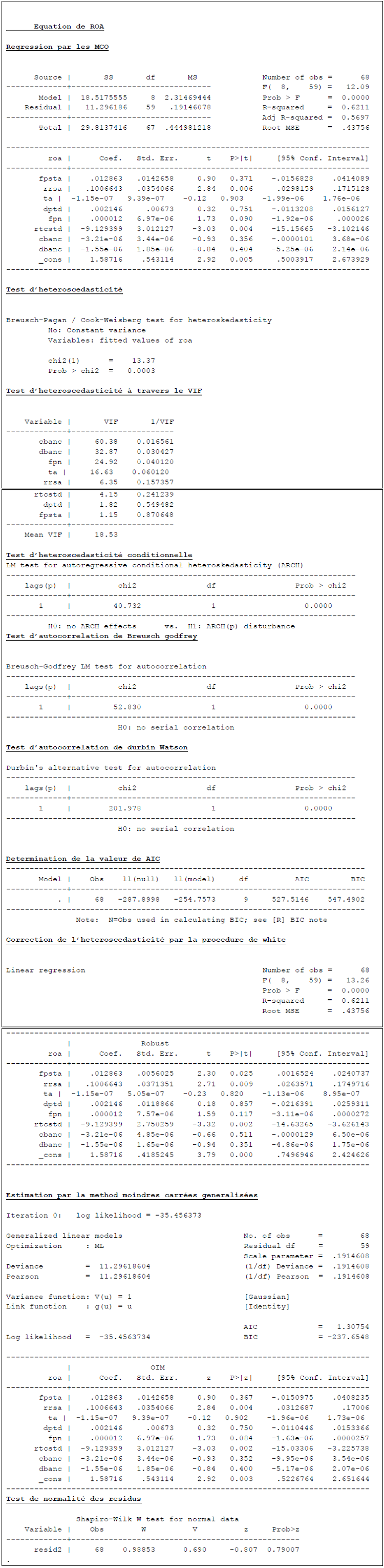 Tableau 1 : résultats des régressions par les MCO, des tests d’autocorrélation et d’hétéroscédasticité et la régression par les MCG du modèle ROE.
