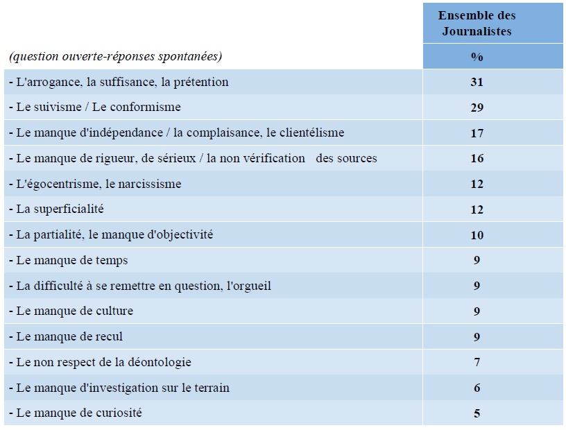 QUESTION : Selon vous quels sont les trois défauts principaux des journalistes ?