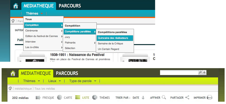 A ces trois points de contact se surimposent deux modes de lecture distincts : la médiathèque et le parcours. La distinction entre ces deux modes de lecture repose essentiellement sur deux conceptions du savoir et de l’accès au savoir. D’une part, un savoir encyclopédique tabulaire sur le modèle de l’encyclopédie. Le mode de lecture « médiathèque » repose sur ce modèle qui fait écho à une conception scolaire du savoir ainsi qu’aux différents moyens d’accéder à ce savoir tels que le livre, l’encyclopédie ou le dictionnaire. D’autre part, existe un mode d’accès au savoir qui prend réellement l’internaute par la main. La constitution de dossiers selon les différentes époques du festival de Cannes recoupe une conception commune et profondément ancrée de l’histoire qui en fait une succession de périodes. Cette fragmentation chronologique permet de conférer une cohérence entre les différents contenus du site que le découpage thématique n’est pas en mesure d’apporter.