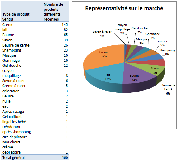 *Ce graphique fut réalisé à partir de la base de données de 460 produits contenant du karité que nous avons recensés. Nous voyons donc ici l’importance des différents types de produits à base de karité sur le marché européen et français en particulier.