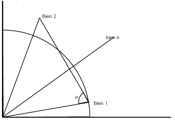 Supposons un marché où se trouvent deux biens, et que le bien 1 a un prix inférieur au bien 2. Un producteur veut lancer sont produit sur ce marché. On connaît les caractéristiques et les prix des biens sur ce marché, donc l’angle formé par la frontière de caractéristique et le bien 1 (a). On appelle a la portion de frontière de caractéristiques qui sépare le bien 1 et le bien n, pi le prix du bien i et p le prix du bien n.. Le problème du producteur sera de créer rapport de caractéristique optimal en fonction des deux autres biens. On obtient la figure suivante :
