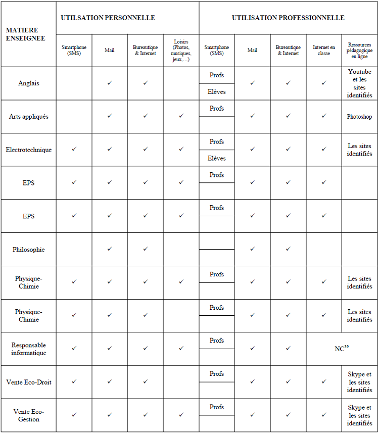 Annexe 3 : GRILLE SYNTHETIQUE DE L’ENQUETE admin 12 ans ago 39 Non concerné par la question Page suivante : Annexe 4 : SOCLE COMMUN DE CONNAISSANCES ET DE COMPETENCESRetour au menu : Les nouvelles technologies en éducation, mariage forcé ou mariage heureux ?