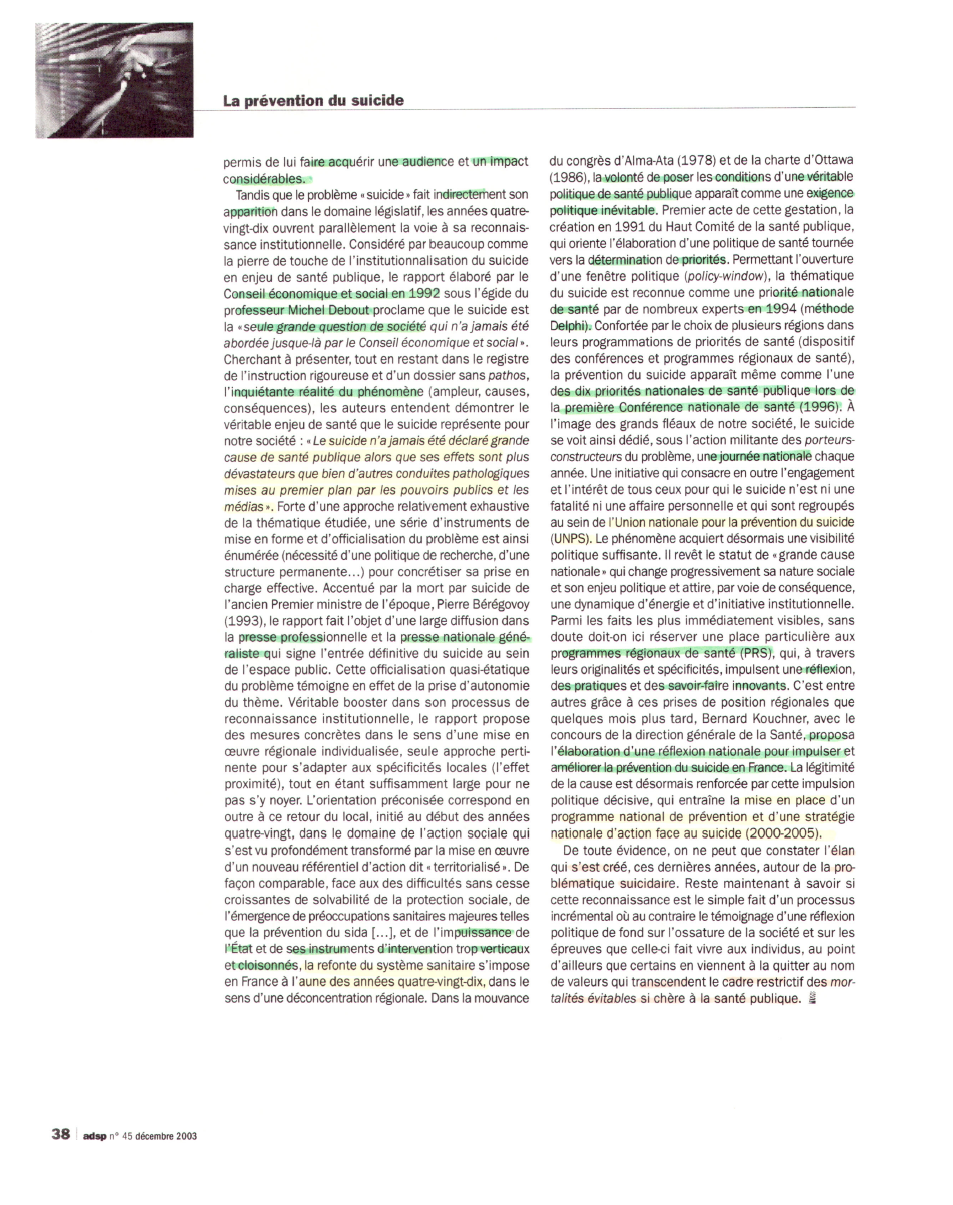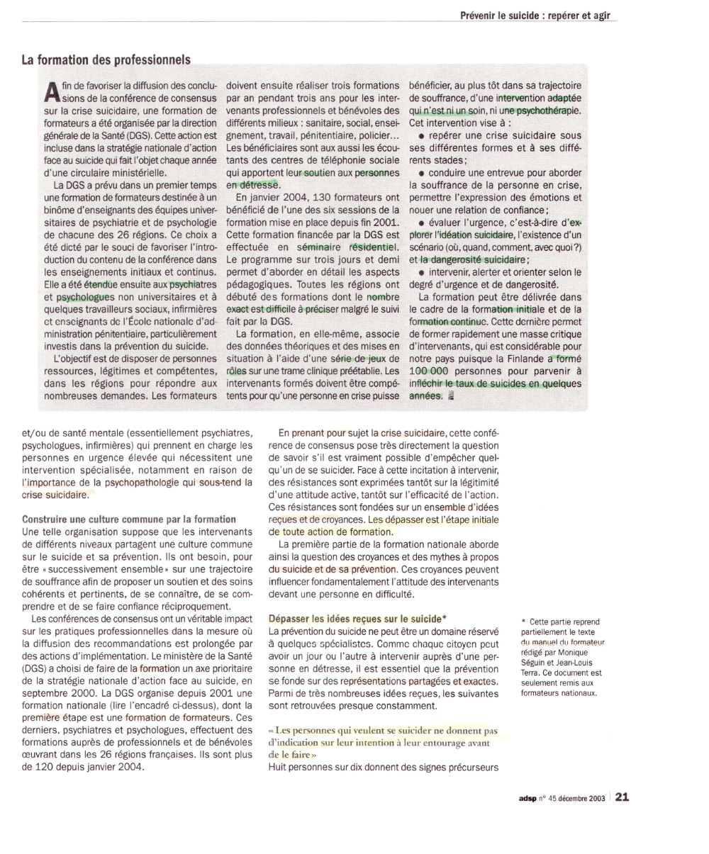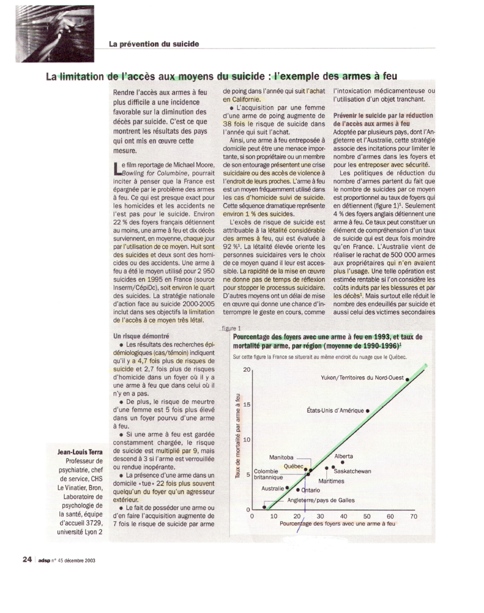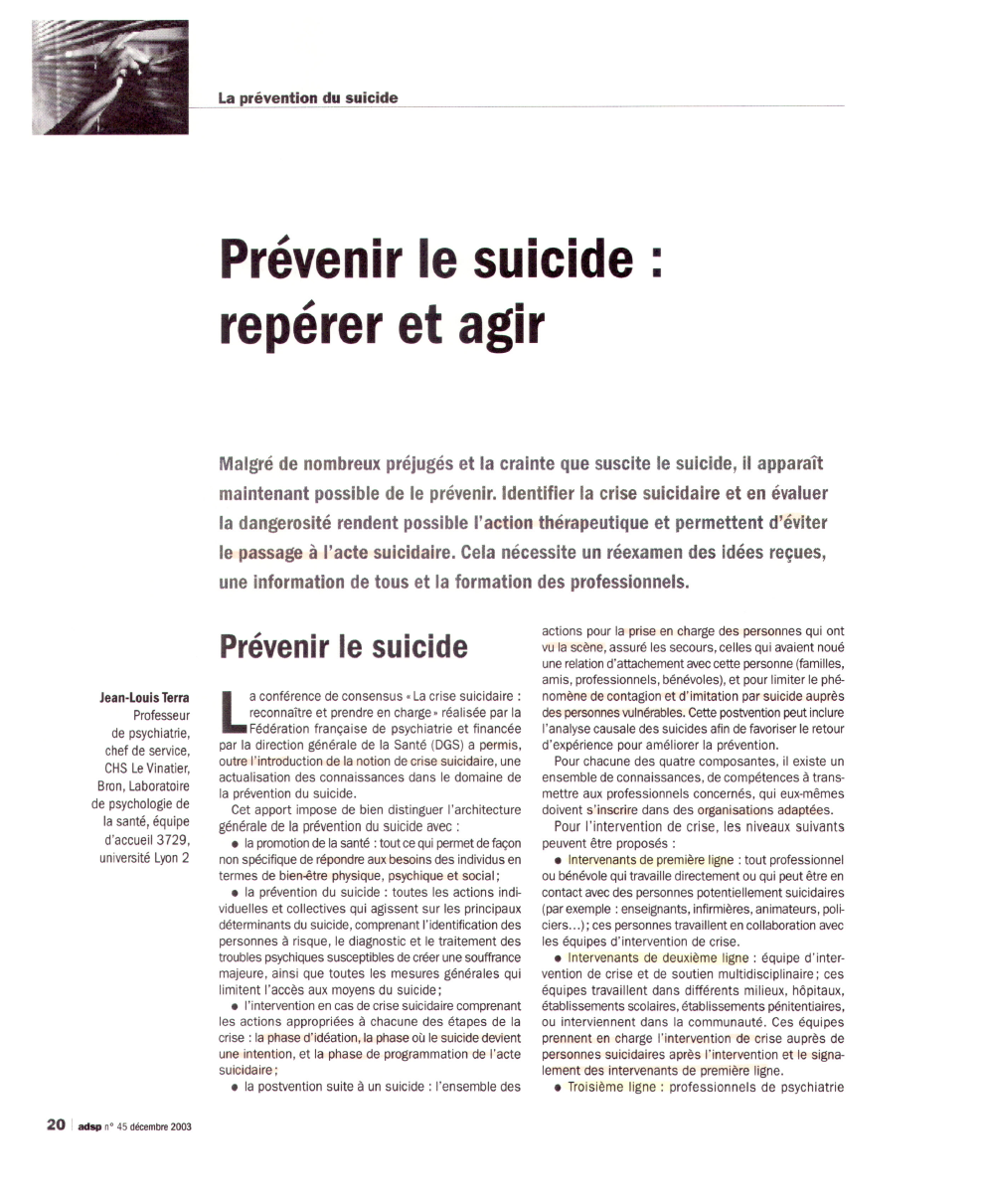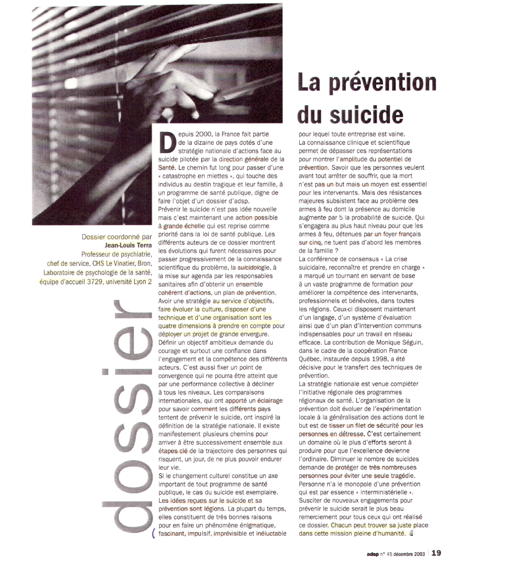 Annexe 3 : Jean-Louis TERRA (coord.), dossier « La prévention du suicide », adsp n°45, décembre 2003