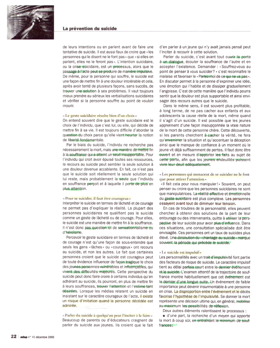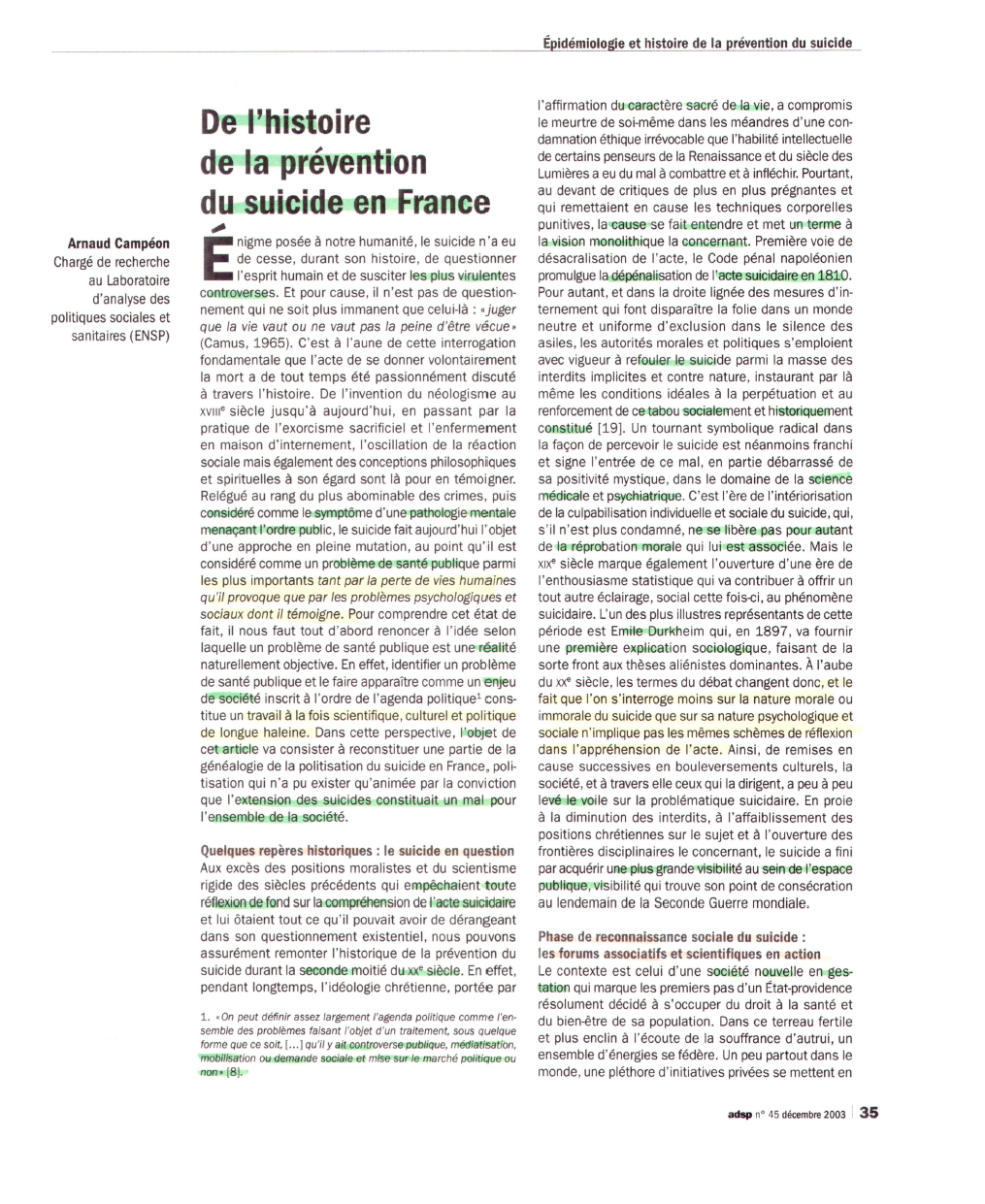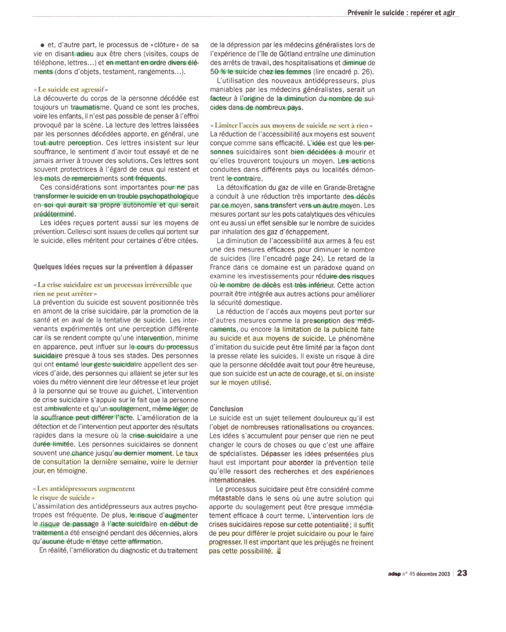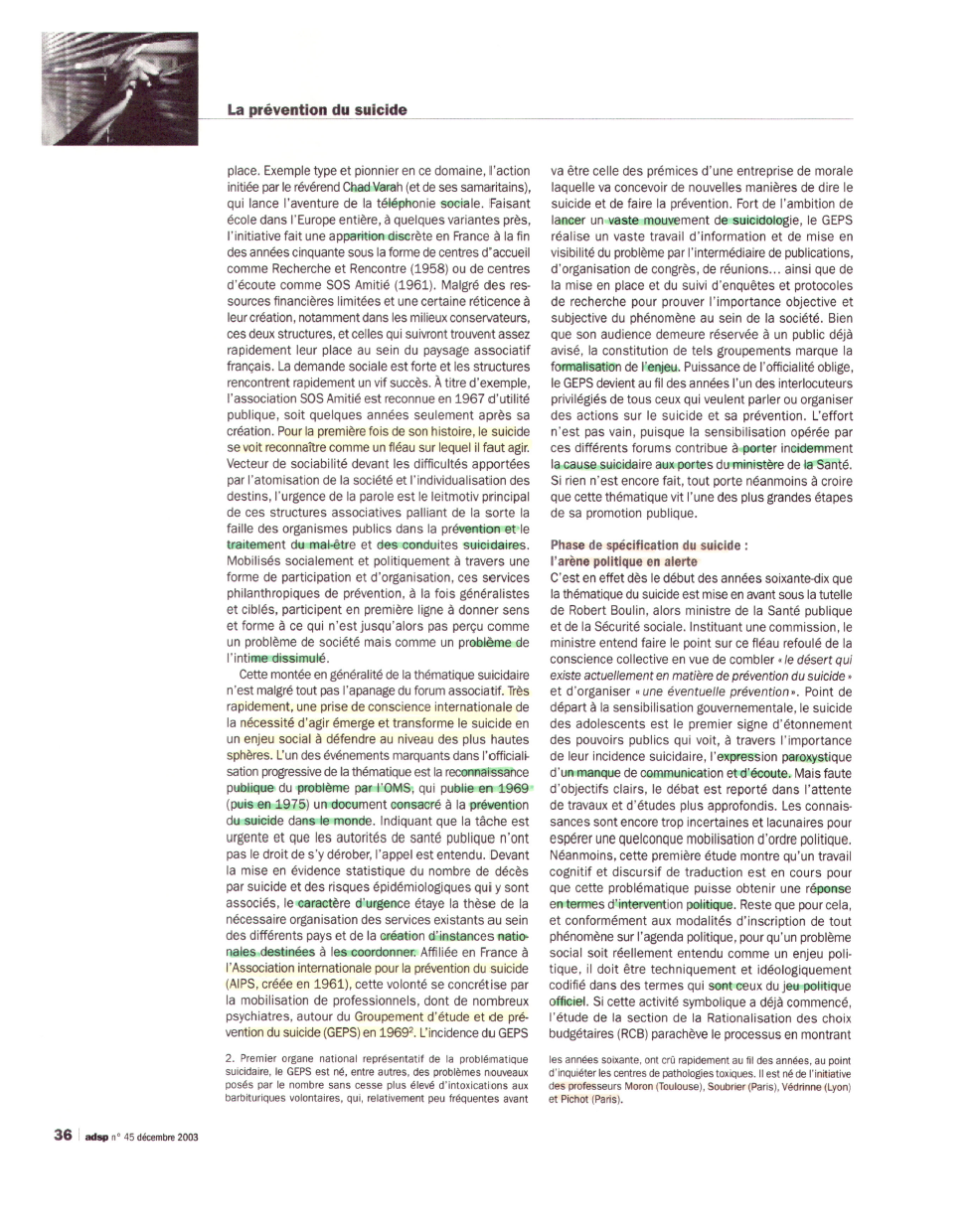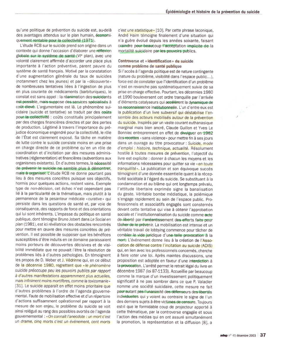 Annexe 3 : Jean-Louis TERRA (coord.), dossier « La prévention du suicide », adsp n°45, décembre 2003
