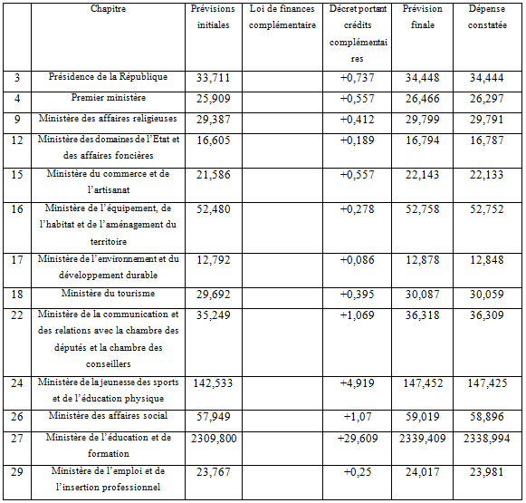 Tableau C : les dépassements des crédits de la Partie I « rémunérations publiques » autorisés par voie de crédits complémentaires pour l’année 2008. En million de dinars (155).