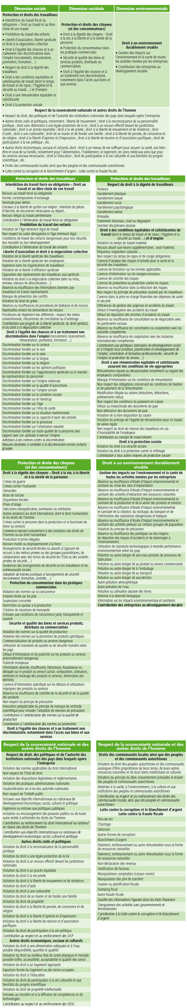 « Principales thématiques recensées dans les principes directeurs de l’OCDE, dans la déclaration tripartite de l’OIT, dans le pacte mondial et dans le Projet de Normes des Nations Unies ainsi que dans le rapport de John Ruggie (2008) » par Olivier Maurel