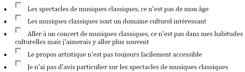 Quelles sont les phrases qui correspondent à votre état d'esprit concernant les concerts ou festivals de musiques classiques
